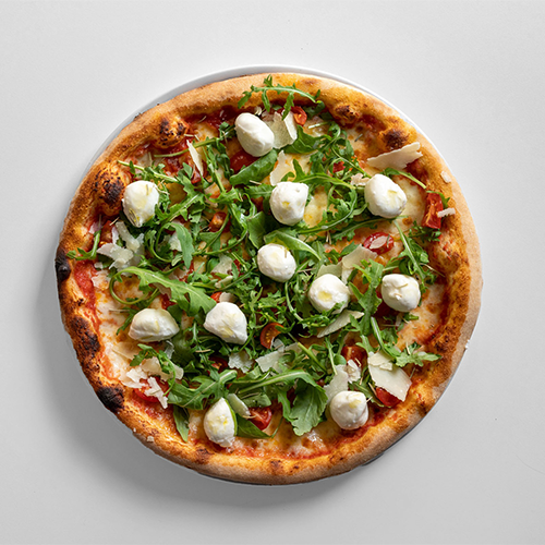 Sauce tomate, mozzarella, jambon cru, roquette, tomates cerise, copeaux de grana padano