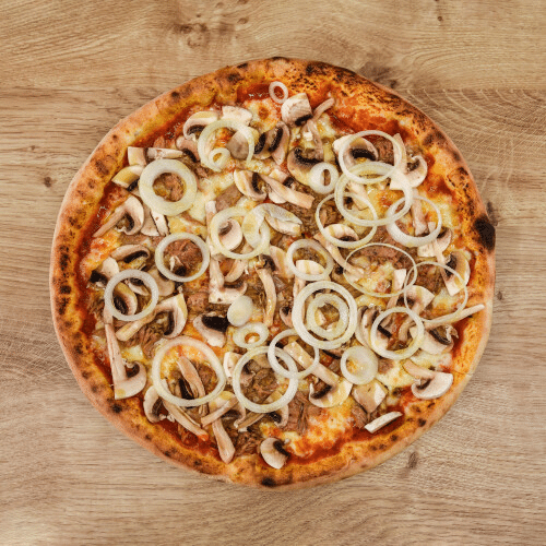 Sauce tomate, mozzarella, thon, champignons, oignons